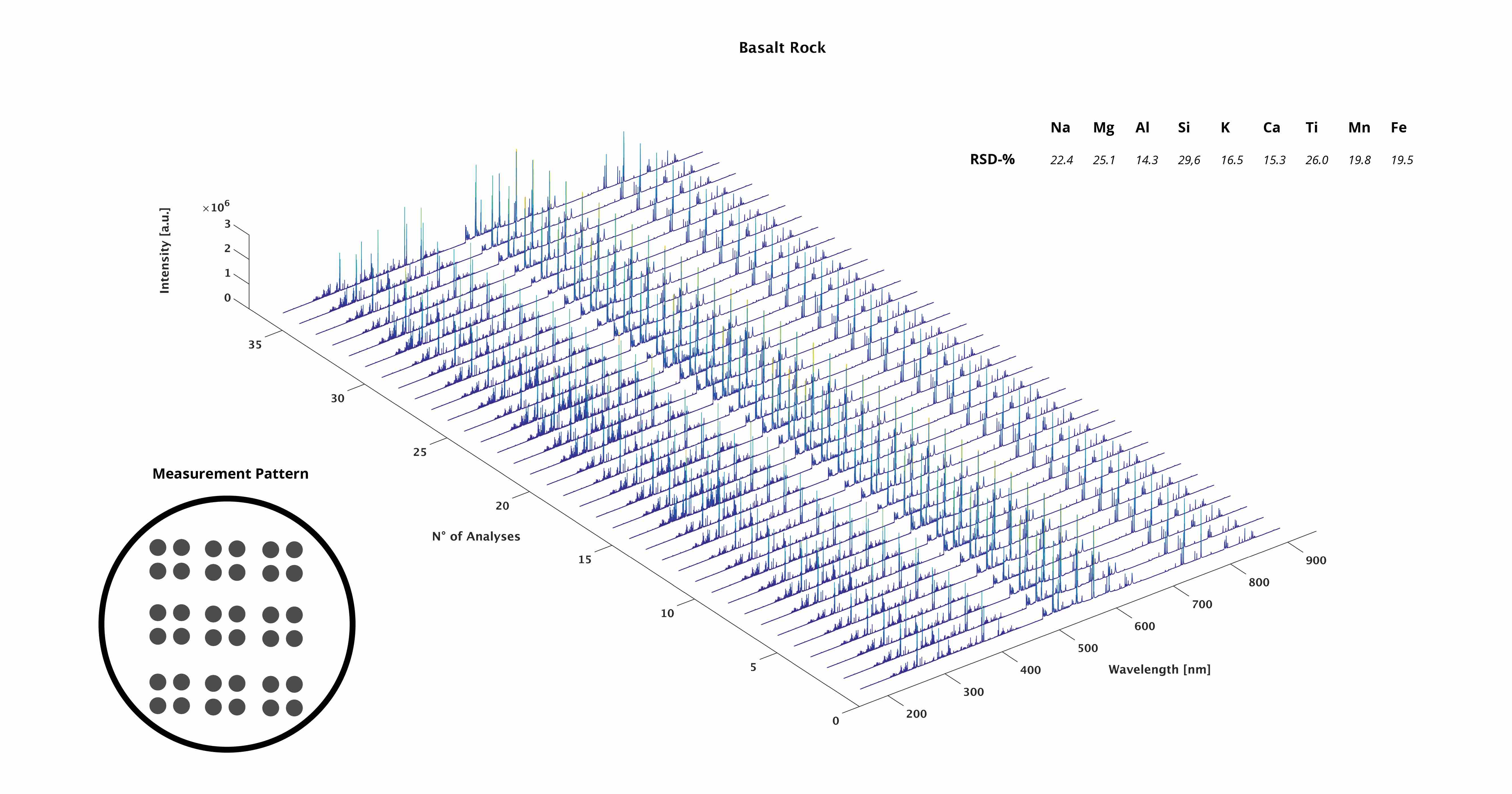This light is then transferred through a fiberoptic cable to a spectrometer, which can precisely split the light into its respective wavelengths. The working principle of the LIBS-spectrometer is similar to a prism as it disperses the incomming light. Each element has several characteristic wavelengths. A detector is able to attribute an intensity to each of them.