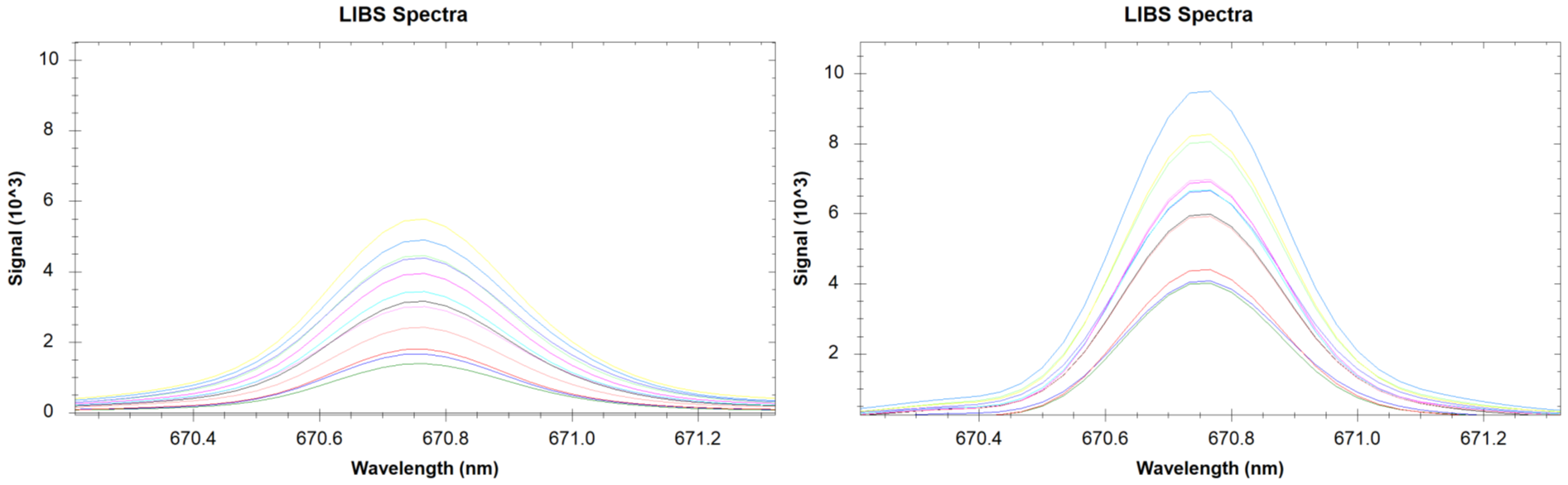 The left figure shows 10 measurements for lithium on a Nano-Pellet made from OREAS 147. The right figure shows 10 measurements on a pressed pellet made from original OREAS 147 powder. It is interesting to note that the signal intensity is lower in the Nano-Pellets compared to the original pressed pellets. Most likely this is due to the shiny polished luster of the Nano-Pellets, which reflects some of the incoming IR-laser light. While the signal is higher in the pressed pellets it is also more scattered. This shows a need for sampling and averaging a larger surface area on the sample to obtain an accurate average spectrum.