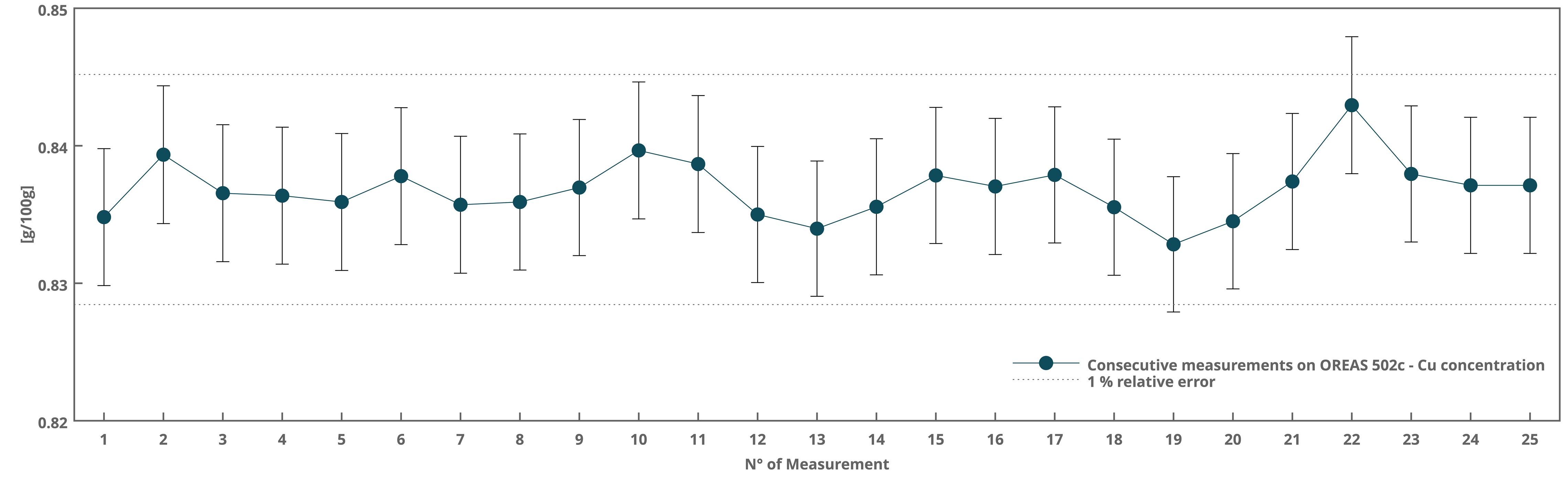 This plot shows the results for Cu of 25 consecutive analyses on a single pressed pellet made from OREAS 502c. The analysis time for each data point was 4 min. and the error bars indicate the 3 SD given by the instrument. This displays excellent instrument stability, as the data points are statistically indistinguishable as well as pressed pellet stability during repeated x-ray irradiation.