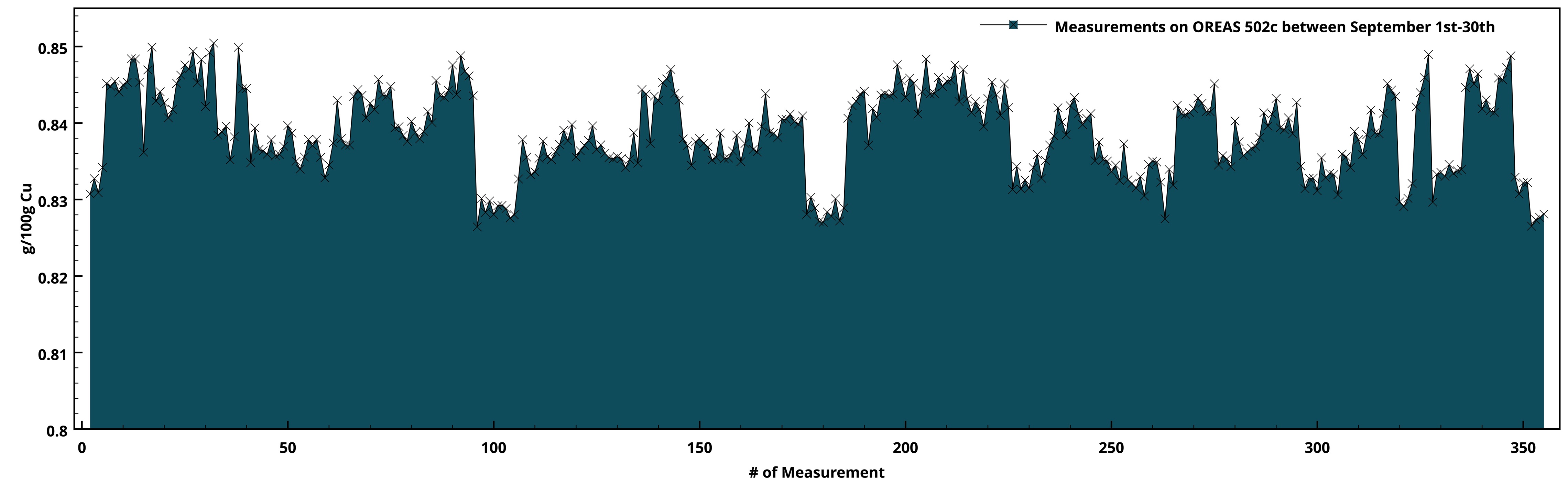 This plot shows all 355 measurements performed on five different pressed pellets made from OREAS 502c between September 1st and 30th 2023. The results for copper (Cu) varied between 0.83 to 0.85 g/100 g meaning a deviation of only 0.2 g/100 g. Additionally, this highlights within and between pellet homogeneity and stability during repeated use as well as instrument stability.