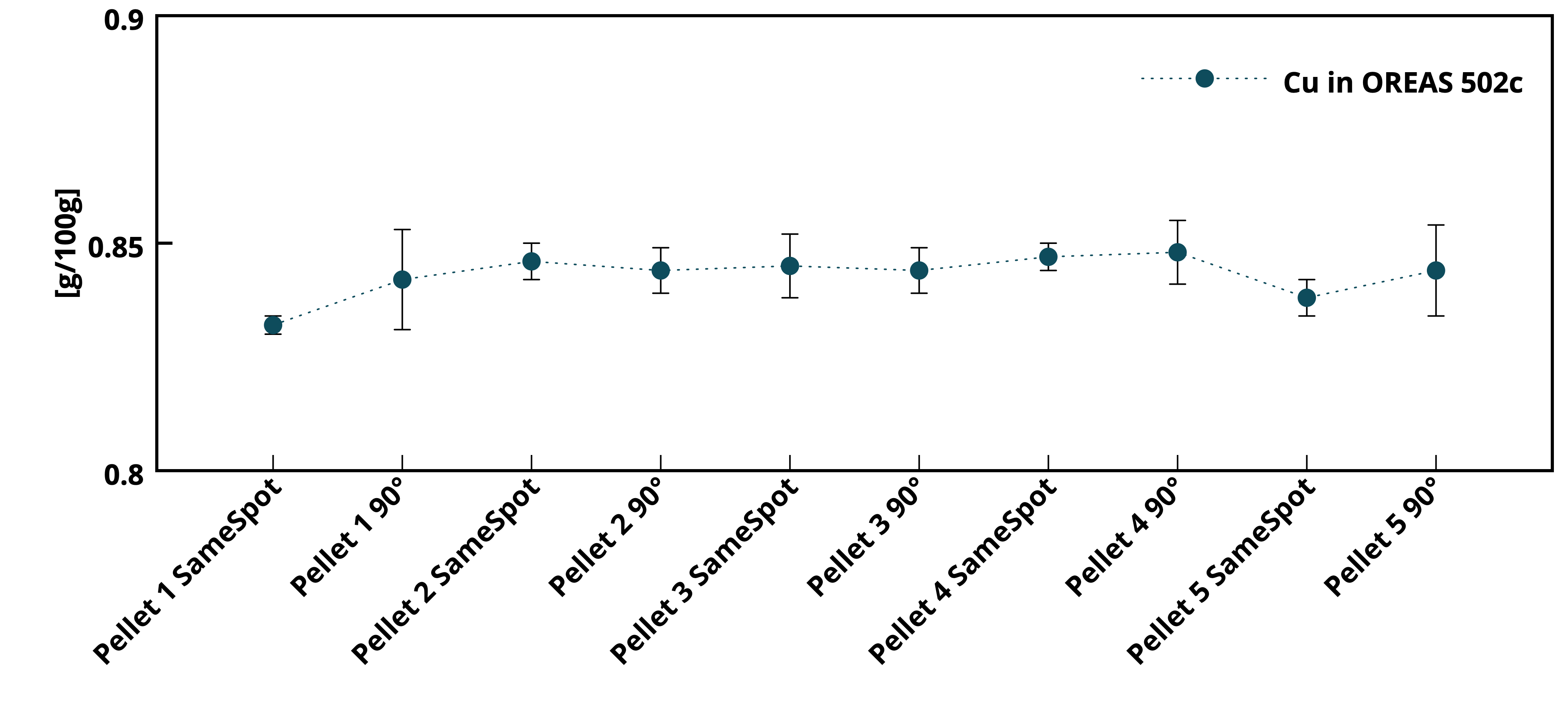 A homogeneity test comprised of five pressed pellets made from OREAS 502c was performed. Each pellet was measured four times in the same spot and four times while rotating the sample 90° between each measurement. The results show excellent within- and between pellet homogeneity. The error bars are 2 SD of the four aforementioned measurements.The graph shows the homogeneity as an example for copper.