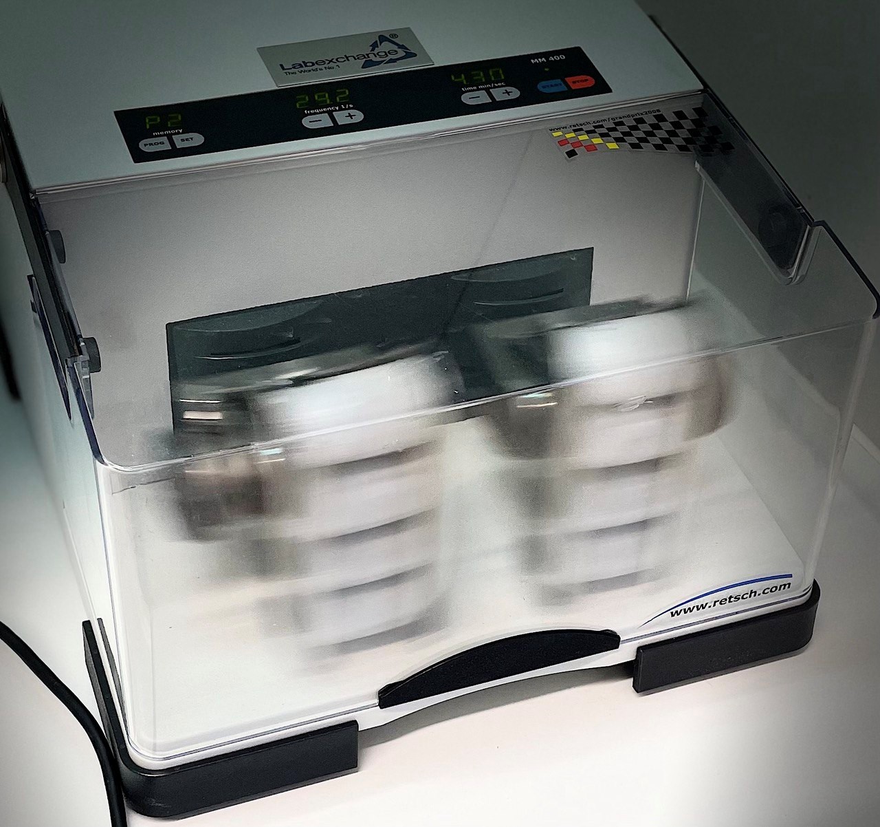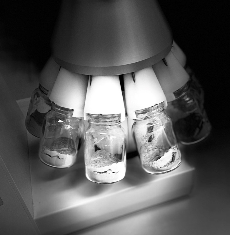 Spinning like the Earth, but with a lot more chaos, she grinds even the toughest samples into fine, analytical-grade powder. Four grinding jars orbit the center like loyal moons, each one shaking up the contents with centrifugal fury.
